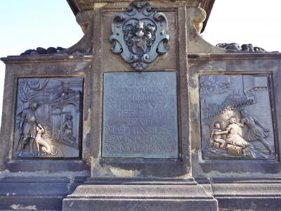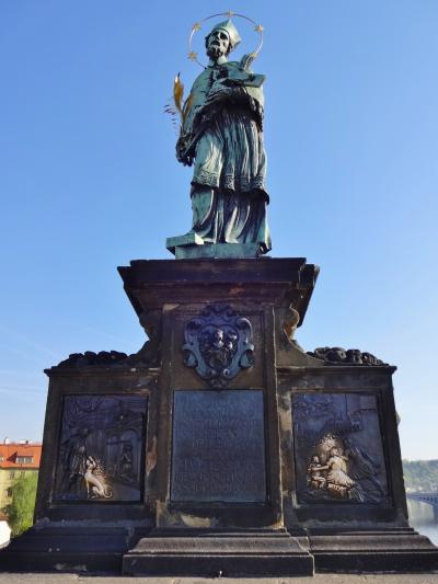 カレル橋の中央付近にある聖人像の一つです。聖ネポムツキー像の頭には5つの星があるのでわかりやすいです。銅像下の台座にある2つのレリーフに触れると幸運が訪れるといわれています。多くの観光客が触れていくこともあり、その部分だけがピカピカに光っていました。