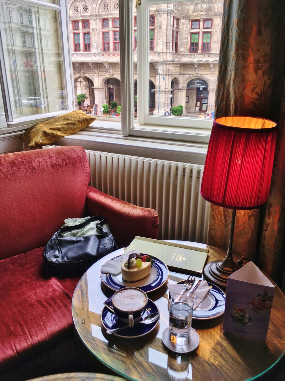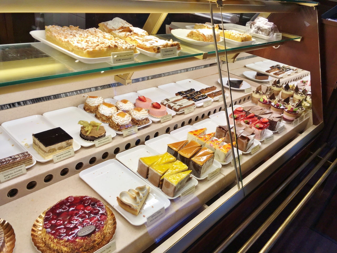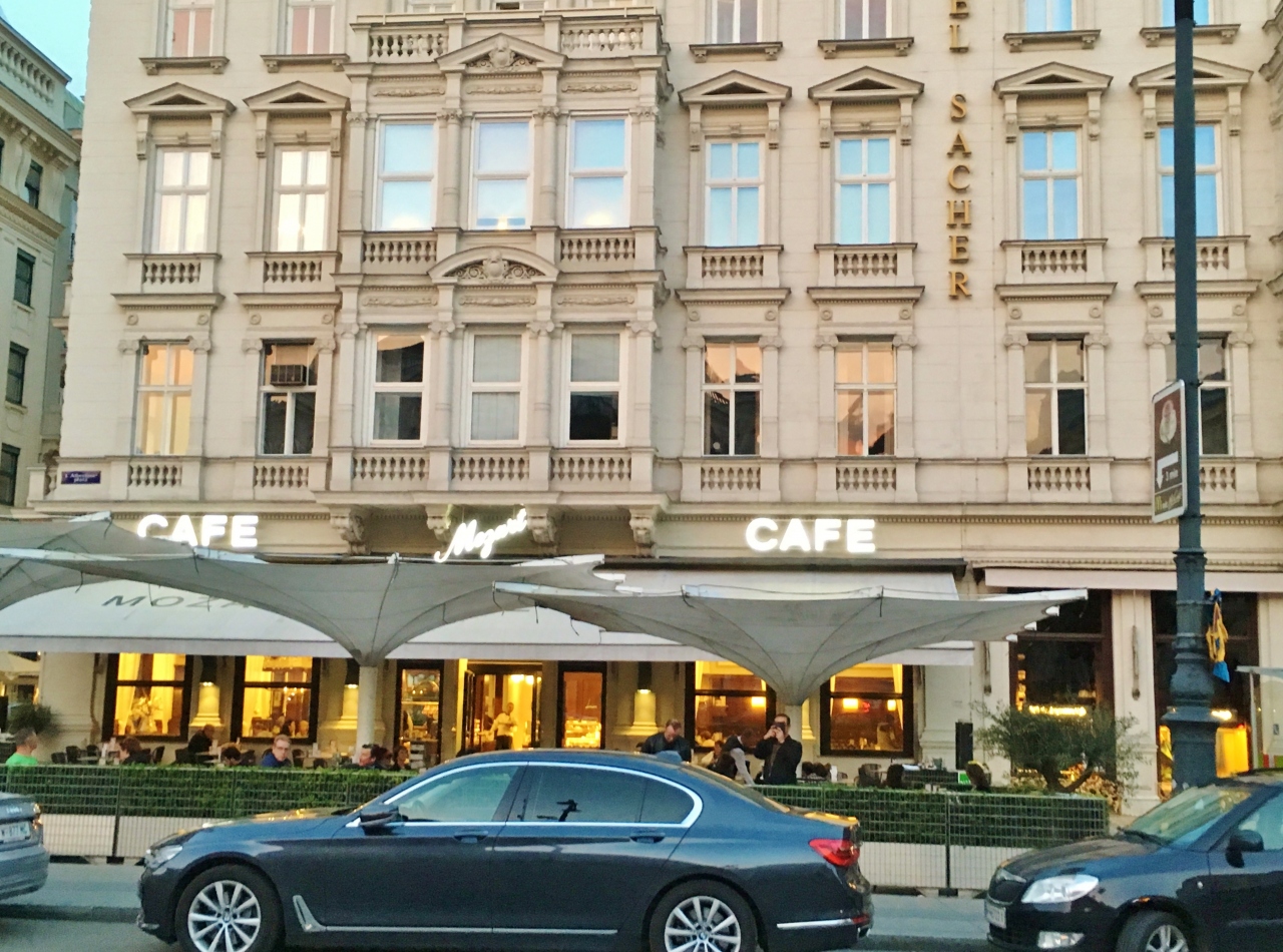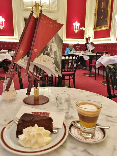 ケルントナー通りのオペラ座向かいにあります。1階がショップ、カフェ兼バーが2階、3階は昼からオープンするカフェ&レストラン。カフェの利用で開店時に入ったので誰もおらず、オペラ座が見える席に座りました。ショーケースにはケーキやチョコレート、またオープンサンドも種類が豊富に揃い、ブランチにも良さそうです。ケーキはホワイトチョコが入ったシャンパンタルトと飲物はメランジェ、追加で注文したチョコがけ苺が想像以上に美味しくお気に入りスイーツとなりました。1階のショップではスミレの砂糖漬けやエリザベートの肖像画が描かれたスパークリングワインを購入しました。3階の内装がとても豪華なので、次回はランチで利用してみたいです。