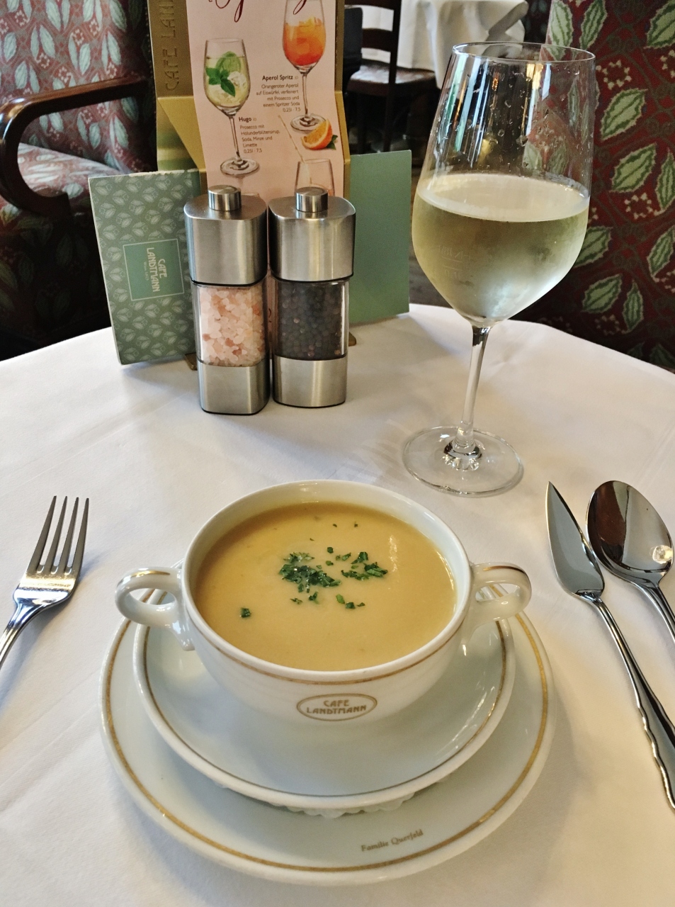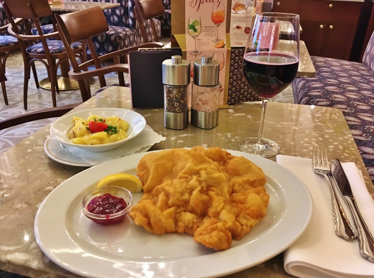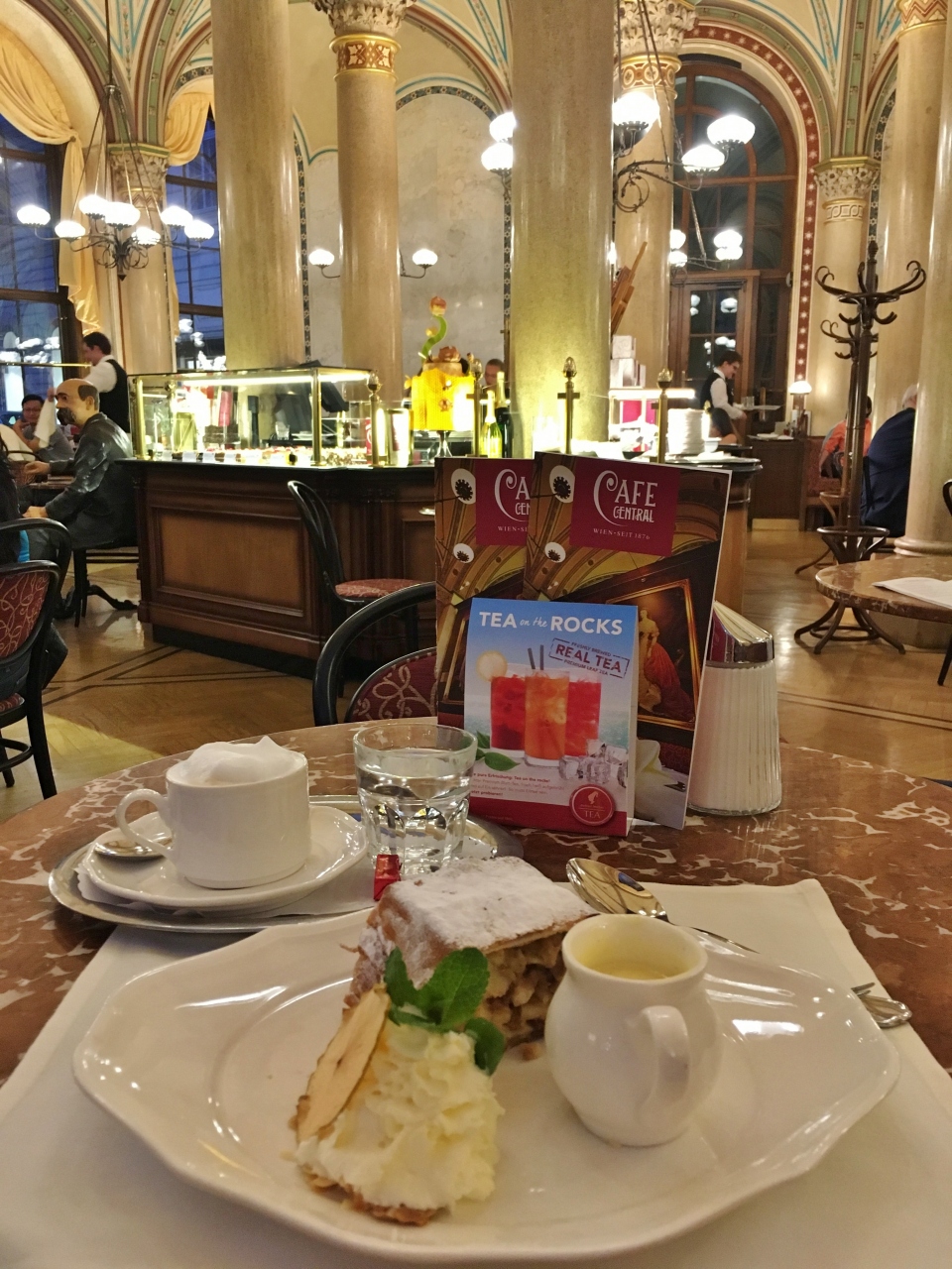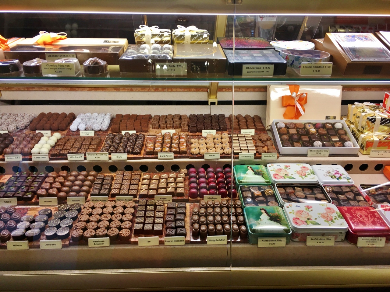 ケルントナー通りのオペラ座向かいにあります。1階がショップ、カフェ兼バーが2階、3階は昼からオープンするカフェ&レストラン。カフェの利用で開店時に入ったので誰もおらず、オペラ座が見える席に座りました。ショーケースにはケーキやチョコレート、またオープンサンドも種類が豊富に揃い、ブランチにも良さそうです。ケーキはホワイトチョコが入ったシャンパンタルトと飲物はメランジェ、追加で注文したチョコがけ苺が想像以上に美味しくお気に入りスイーツとなりました。1階のショップではスミレの砂糖漬けやエリザベートの肖像画が描かれたスパークリングワインを購入しました。3階の内装がとても豪華なので、次回はランチで利用してみたいです。