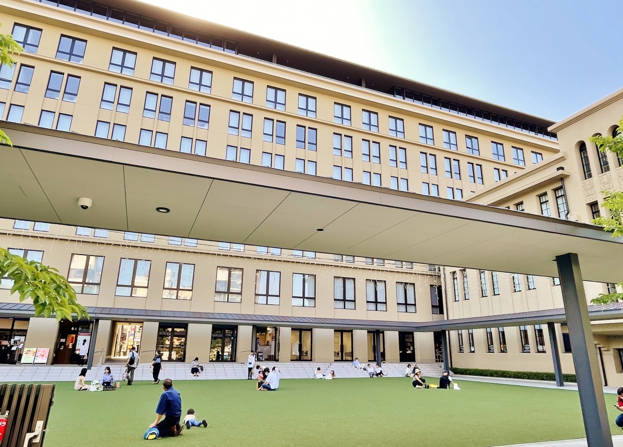 1993年閉校した立誠小学校の跡地に2020年にオープンした複合施設です。ホテルや貸ホール、カフェやショップなどの商業施設がある、広々とした屋外の芝生が印象的です。天気が良かったので芝生広場でのんびりくつろいでいる人が多くいました。
