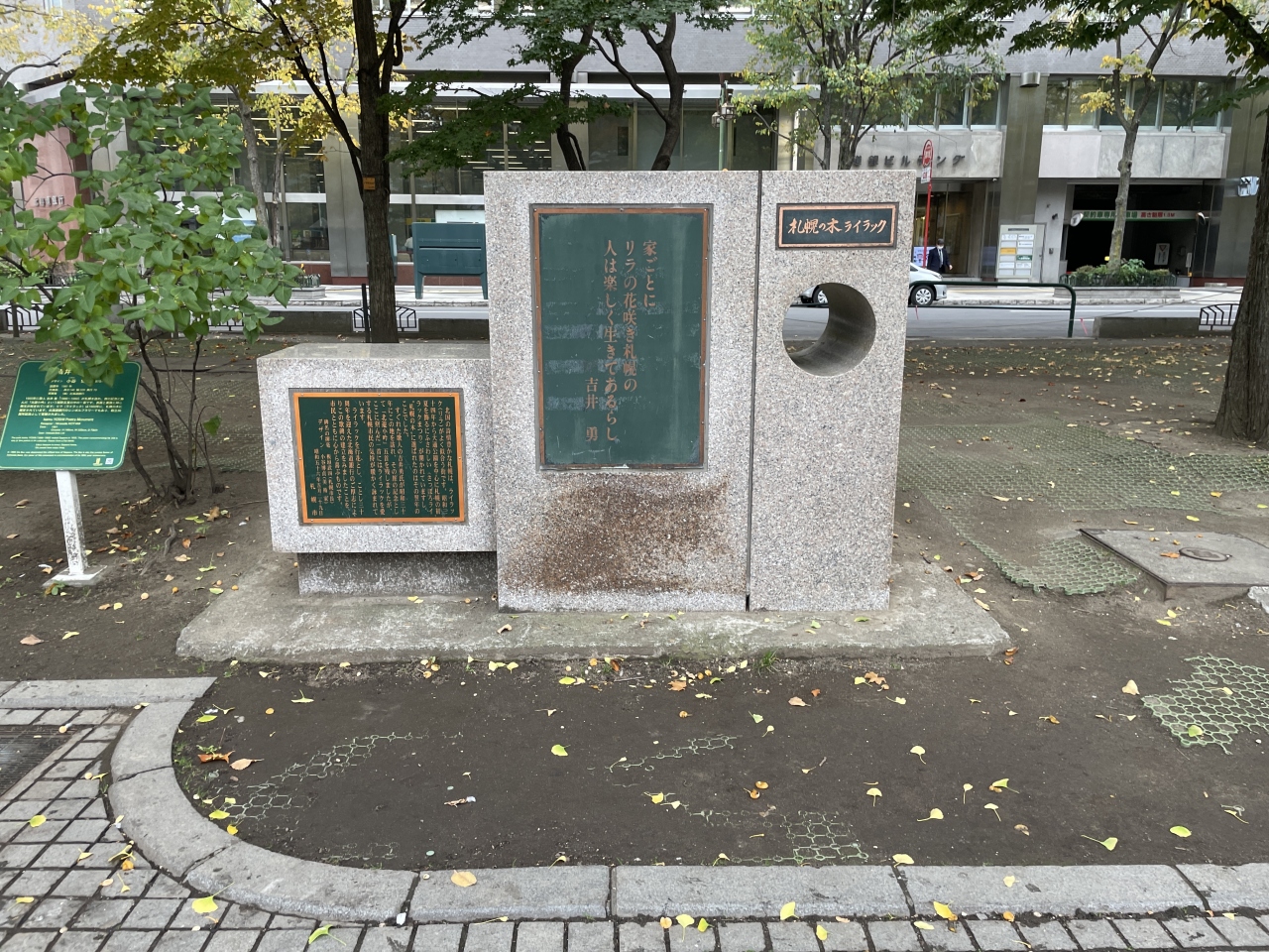 大通公園西4丁目にあります。歌人・吉井勇が一週間の旅行中に詠んだ句とのことで、北海道新聞朝刊に「北遊小吟」というタイトルで掲載されました。歌碑もデザイン性のあって公園の雰囲気に合っているように思います。次回はライラックの花が咲く頃に訪れたいです。