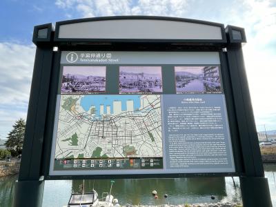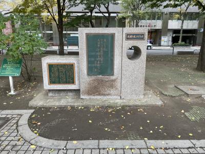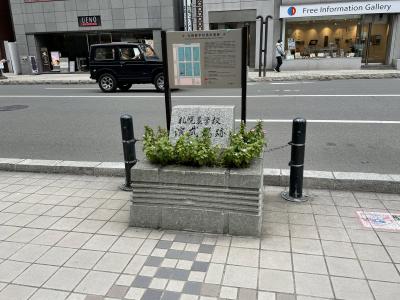 時計台ビルの北側、歩道上に石碑があります。札幌農学校演武場とは現在の札幌市時計台のことで、現在の場所に移される前は、こちらに建っていました。地図入りの説明板も隣接してあるので、位置関係がよくわかります。