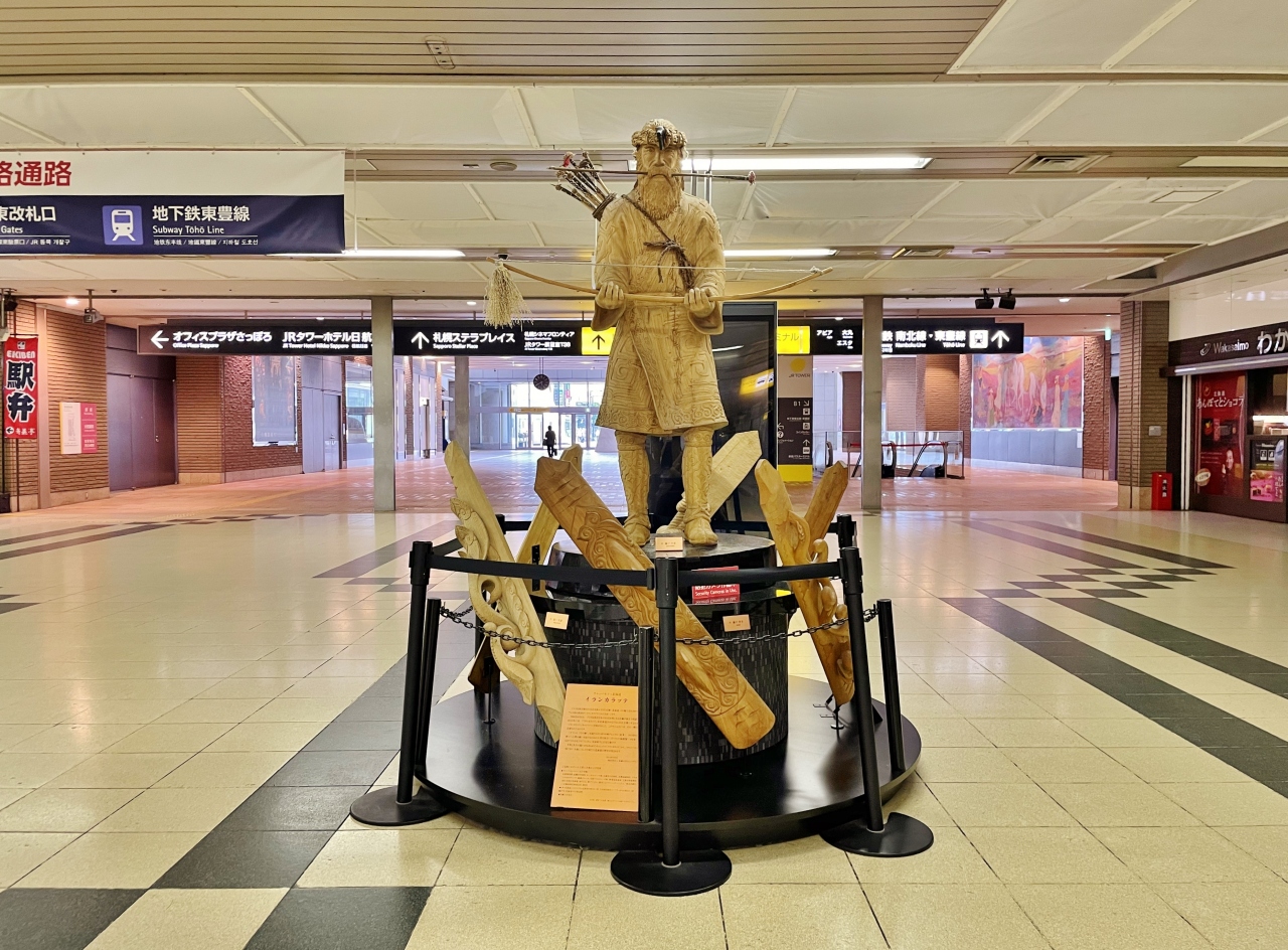 JR札幌駅西コンコースに設置されている彫刻像です。狩猟も恰好をしていて表情や衣装も成功な造りですが、人通りの多い駅にポツンと置かれているので少し異質に感じました。イランカラプテとは、アイヌ語で「こんにちは」を意味すると知って、なるほどと思いました。
