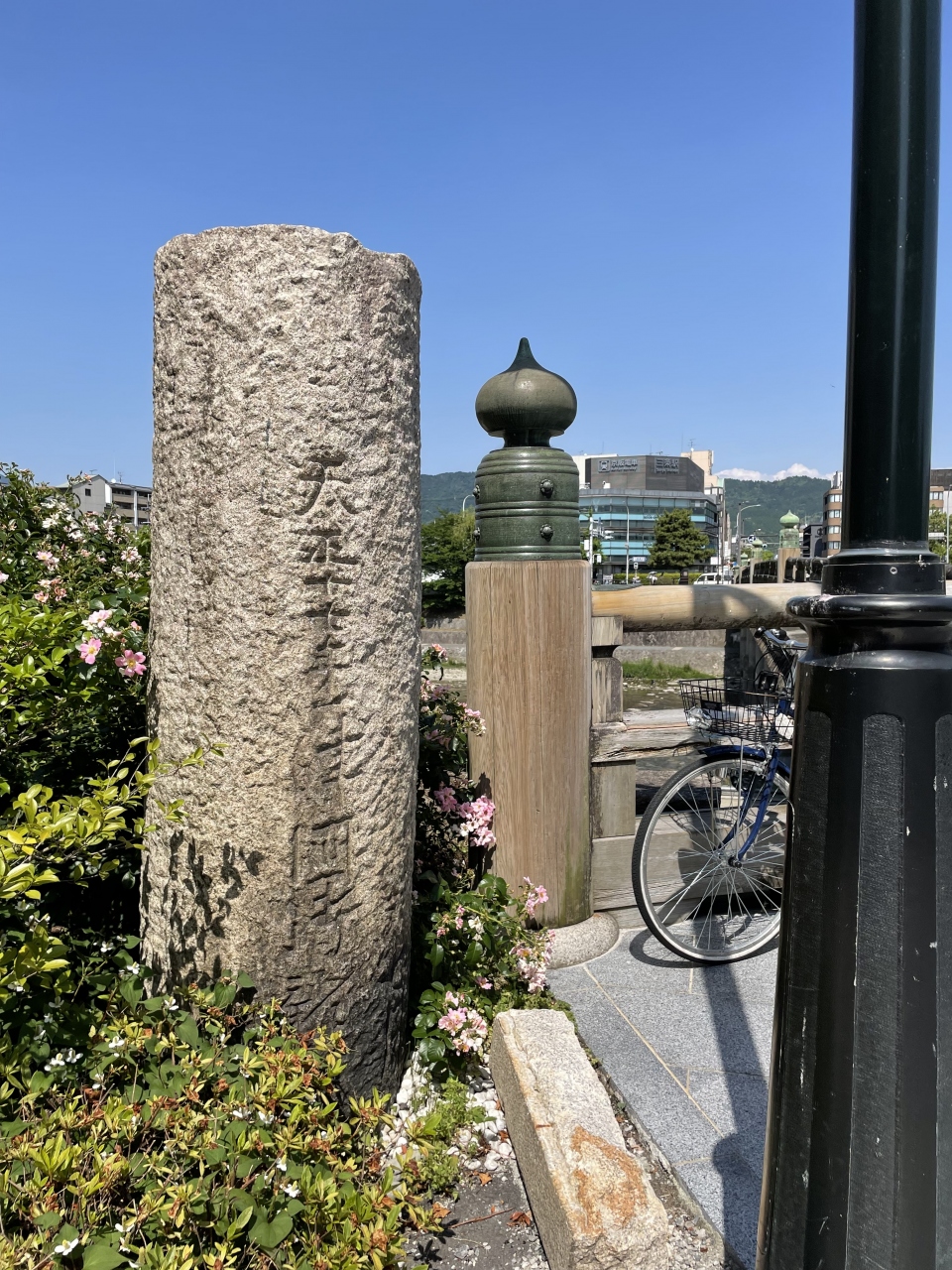 三条大橋に取り付けられている擬宝珠のなかに刀傷がついたものがあります。この刀傷は新選組が池田屋を襲撃した池田屋騒動の時のものと伝わっていますが、確たる証拠や歴史的な裏付けなどはないそうです。実際見ると、刀傷と言われればそう見えるといった程度に感じました。説明板はすぐ近くにある弥次喜多像の隣に立っています。