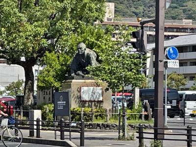 三条大橋の西側袂にある像です。十返舎一九の東海道中膝栗毛に登場する弥次さん喜多さんが、清水寺に詣でた後に三条大橋付近に宿泊する話があります。三条小橋商店街振興組合が道中安全祈願のために建立、近くには撫で石も設置されていました。