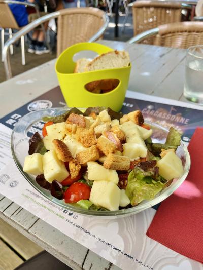 カルカソンヌのシテにあるレストランです。メイン通りから脇道へ入ったすぐのところにあります。店内入って奥に進むとテラスがあり、日陰で暑さもしのげて雰囲気も良かったです。ランチメニューから前菜はサラダ、メインは焼きカマンベールを頂きました。メニューの種類も沢山あり、デザートまで美味しく頂きました。