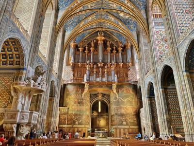 13~16世紀にかけて建設された、世界で最も大きな煉瓦造りの建物です。いままで見てきた教会や大聖堂と比べものにならない程、巨大で威圧感がありました。内部の上部には18世紀のパイプオルガン、下にある左右の壁面は15世紀のフレスコ画で「最後の審判」が描かれています。赤い外観に対して天井画は鮮やかな青色、非常に細やかな装飾が施されています。今まで見た大聖堂とは異なり、壁画や天井画など独特の造りで見応えがある大聖堂でした。