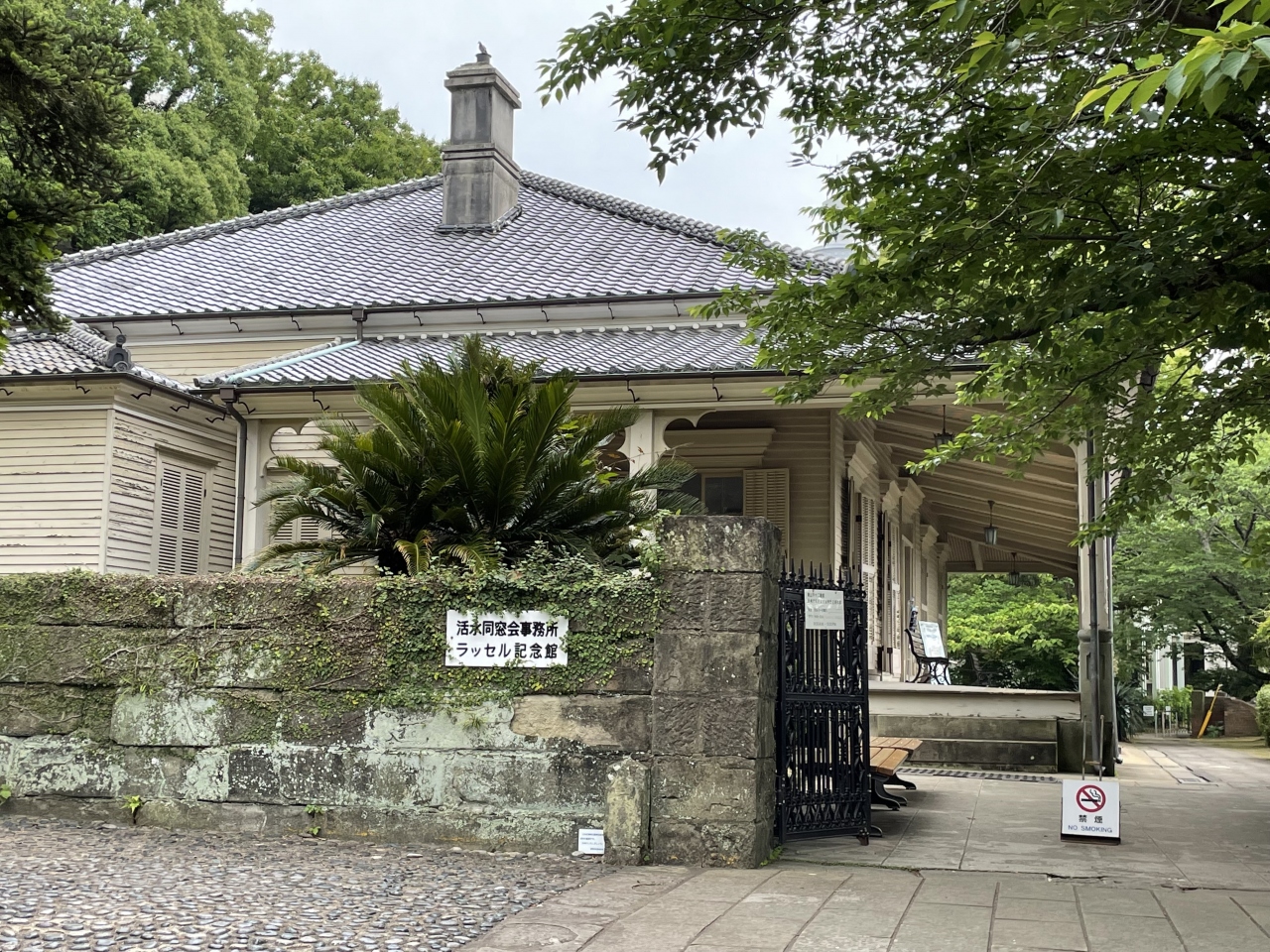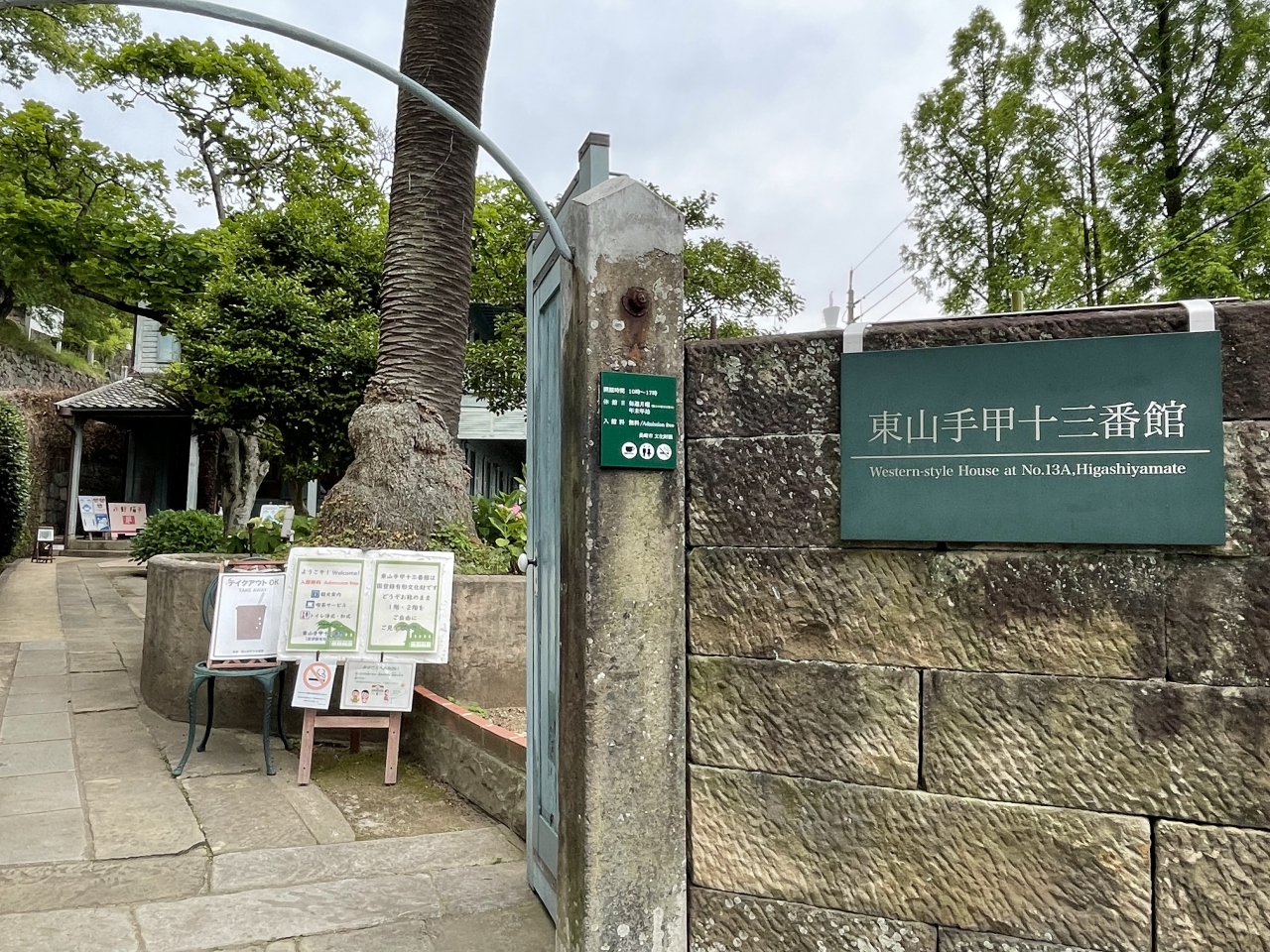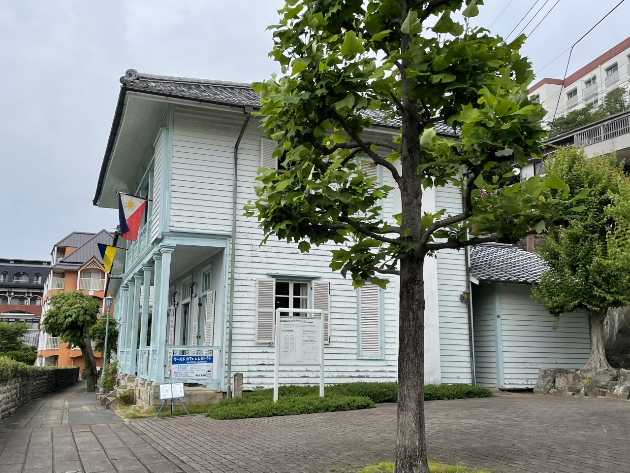 オランダ坂を登って行くと水色の外壁が特徴的な洋風住宅群が建っています。明治20年代後半頃に社宅や賃貸住宅として建てられたそうで、7棟のううち1棟が東山手地区町並み保存センターとして活用されています。1階に東山手洋風建築群に関する写真パネルが展示され、2階は研修室として開放しています。