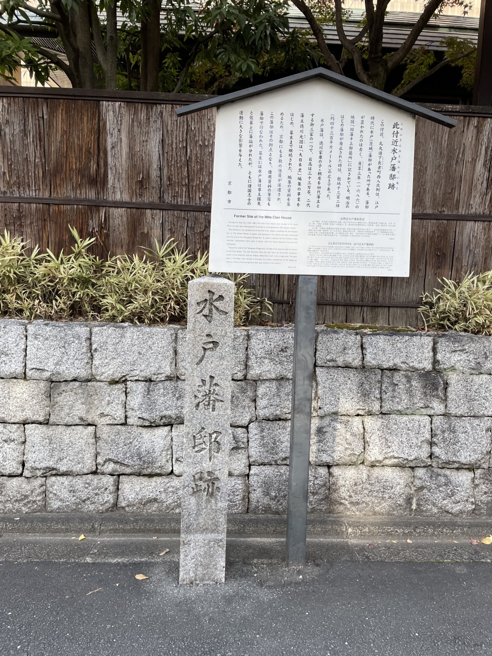 護王神社の北側に石碑と説明板が立っています。水戸藩は徳川家康の御三家の一つで、江戸時代にこの付近に水戸藩邸がありました。歴史は古く、1686年の地図「旧藩々上邸箇所」にも記されています。「大日本史」編集事業のため、京都にも多数の係員が派遣され、この藩邸を拠点として様々な活動が行われたとのことです。