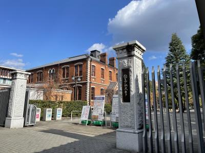 京都御所の北側にあり、地下鉄今出川駅を出るとすぐに入口があります。レンガ造りの建物が並び、日本の大学キャンパスと思えない、ヨーロッパ風の美しい景観です。江戸時代幕末には二本松薩摩藩邸があったため、門前に石碑が立っていて、京都の歴史を感じる場所でもあります。