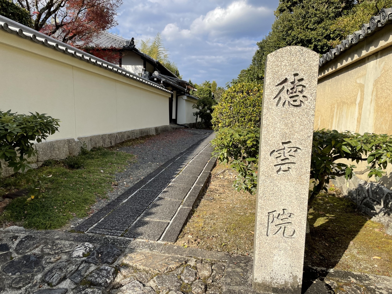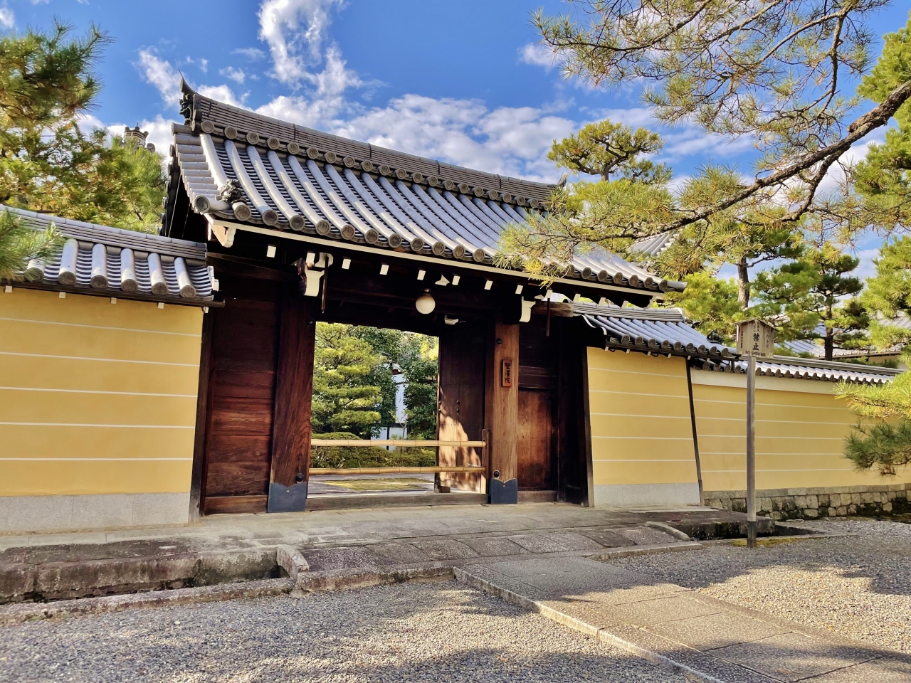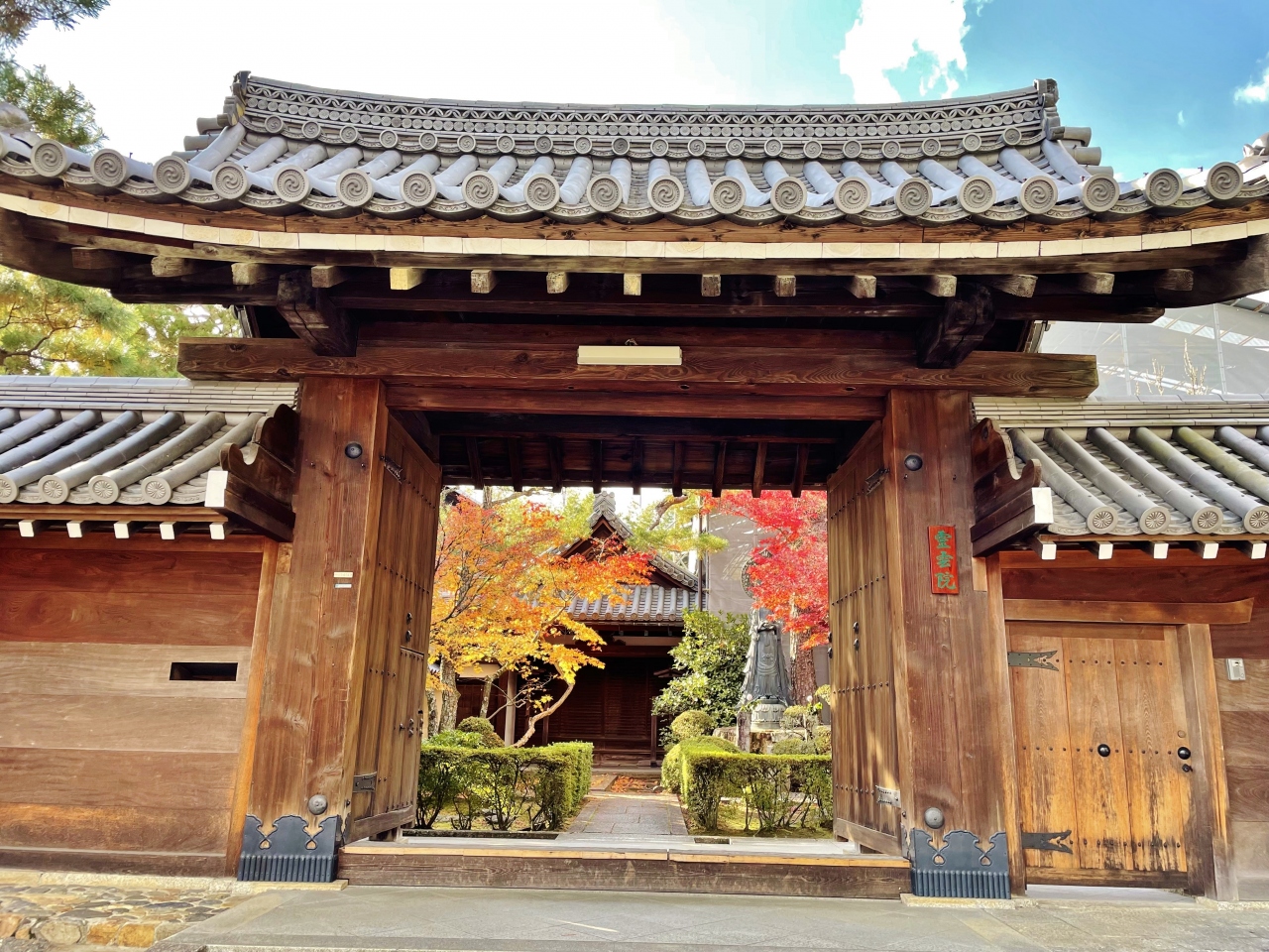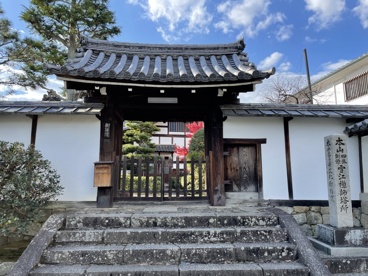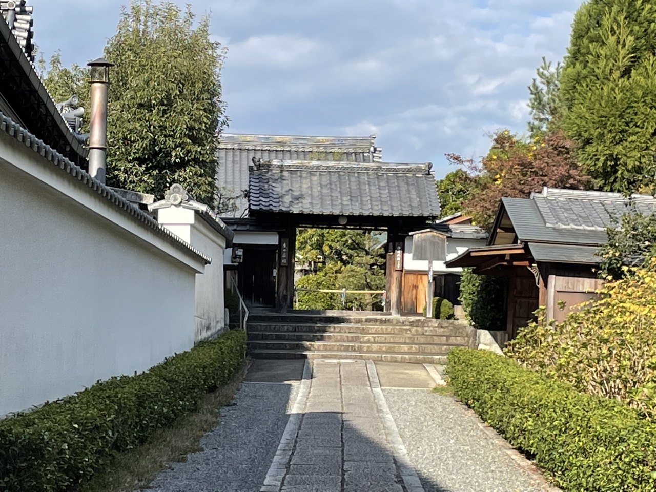 臨済宗妙心寺派の大本山である妙心寺の塔頭で、1506年に創建されました。北門から境内を西側に進み、少し奥まったところにあります。非公開のため本堂など拝観することはできませんが、石畳の参道が続いて趣があり、人通りも少ないので静かに散策できます。