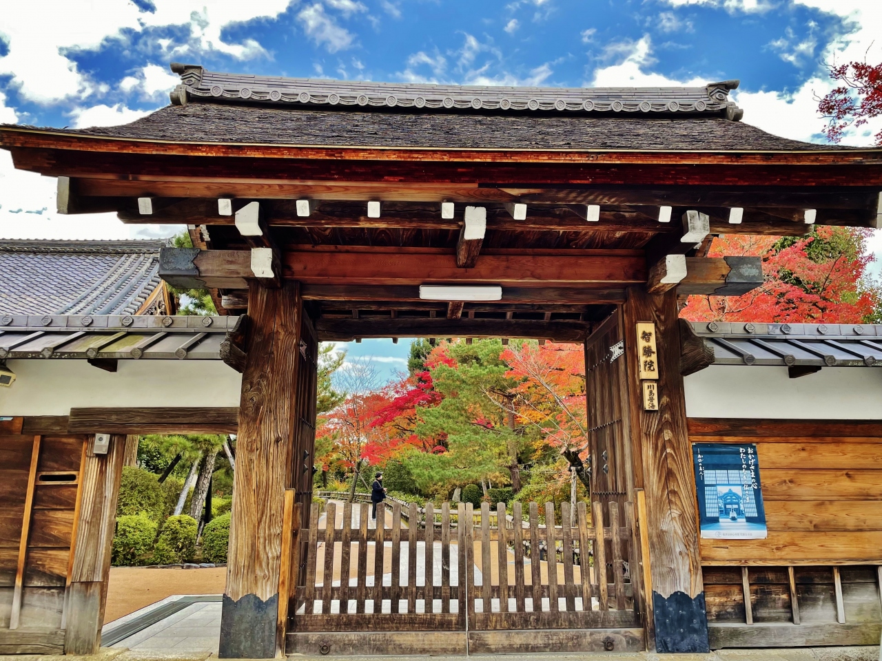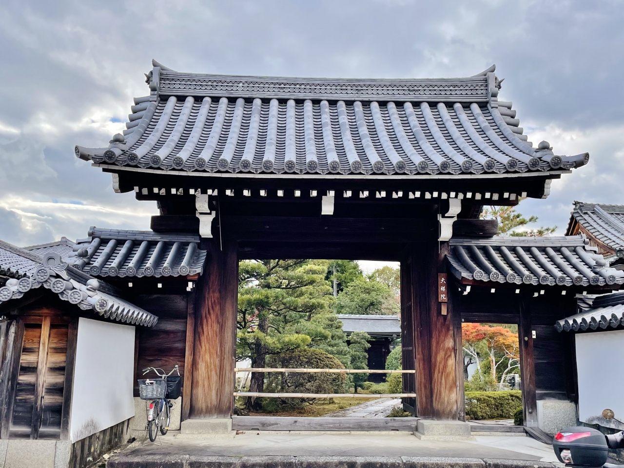 妙心寺の塔頭寺院の一つで北門からすぐのところにあります。普段は非公開で数年に一度公開されているようです。1631年に岡山藩主池田光政が、伯母天球院のため建立されました。狩野山楽・山雪による「竹虎図」や「梅に遊禽図」などの障壁画が見所となっています。山門前からは庭園が見え、良く手入れされていて紅葉も綺麗でした。