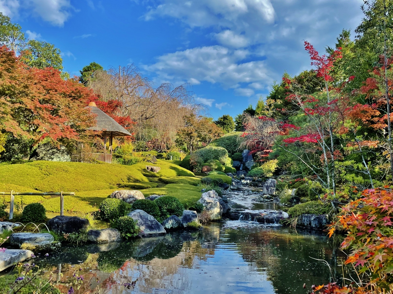 妙心寺に46ある塔頭寺院の一つで、1404年に建立されました。他に桂春院、大心院の3ヶ所が通年拝観可能となっています。日本の初期水墨画である国宝「瓢鮎図」を所有し、枯山水庭園「元信の庭」や四季折々の景色が美しい池泉回遊式庭園「余香苑」など見所が多くあります。枝垂れ桜が有名ですが、紅葉も美しく風情ある庭園の風景でした。