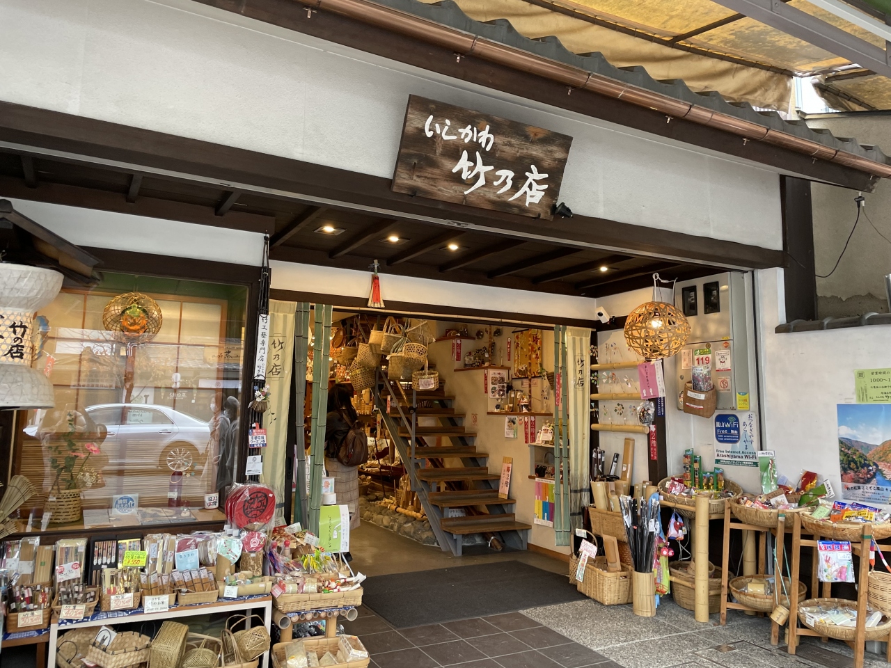 嵐電嵐山駅からすぐ近く、メインストリート沿いにあります。お土産店や飲食店が立ち並ぶところにあるので、入りやすい雰囲気です。店内には竹でできたかごやカバンの他、おもちゃや竹籠、お箸など小物商品も豊富に揃っているのでお土産にも良さそうです。