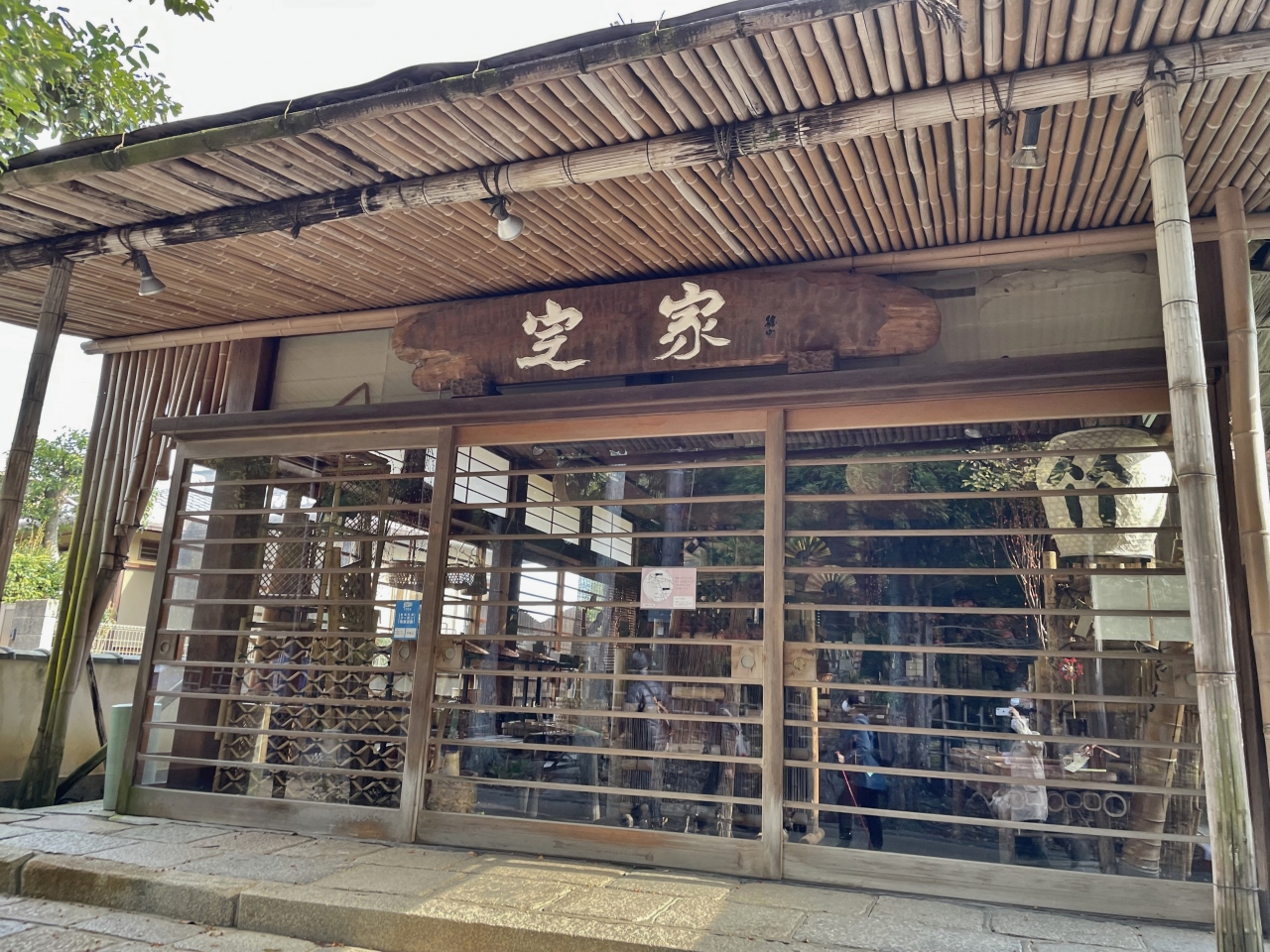 常寂光寺から二尊院へと続く道の途中にあります。竹製品を扱う専門店で、周囲の雰囲気に溶け込んだ趣がある外観です。残念ながらお店は休みのようで扉が閉まっていて中に入ることが出来ませんでした。扉越しに眺めると竹で作られた雑貨や小物などが並んでいました。