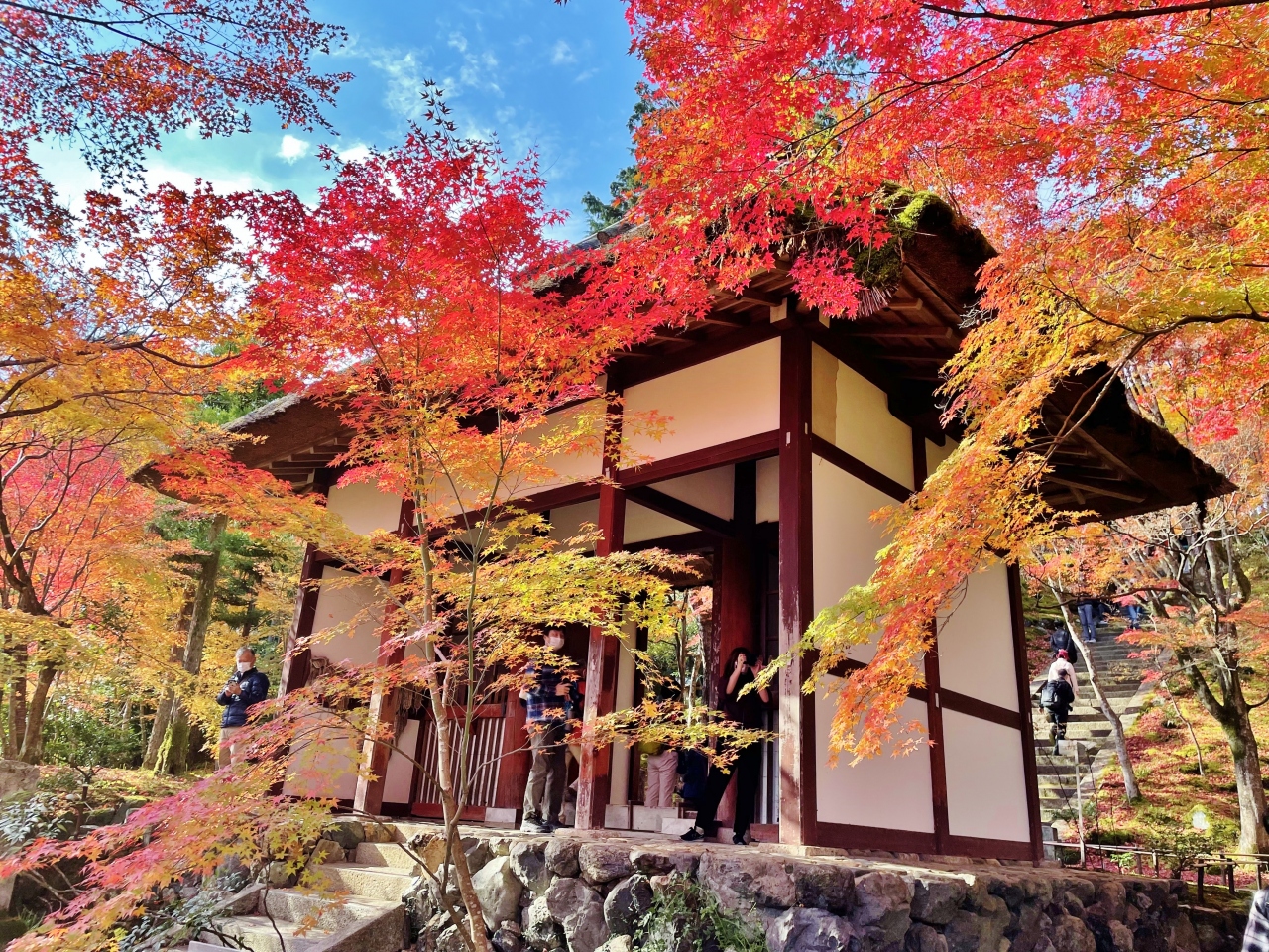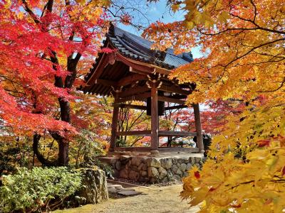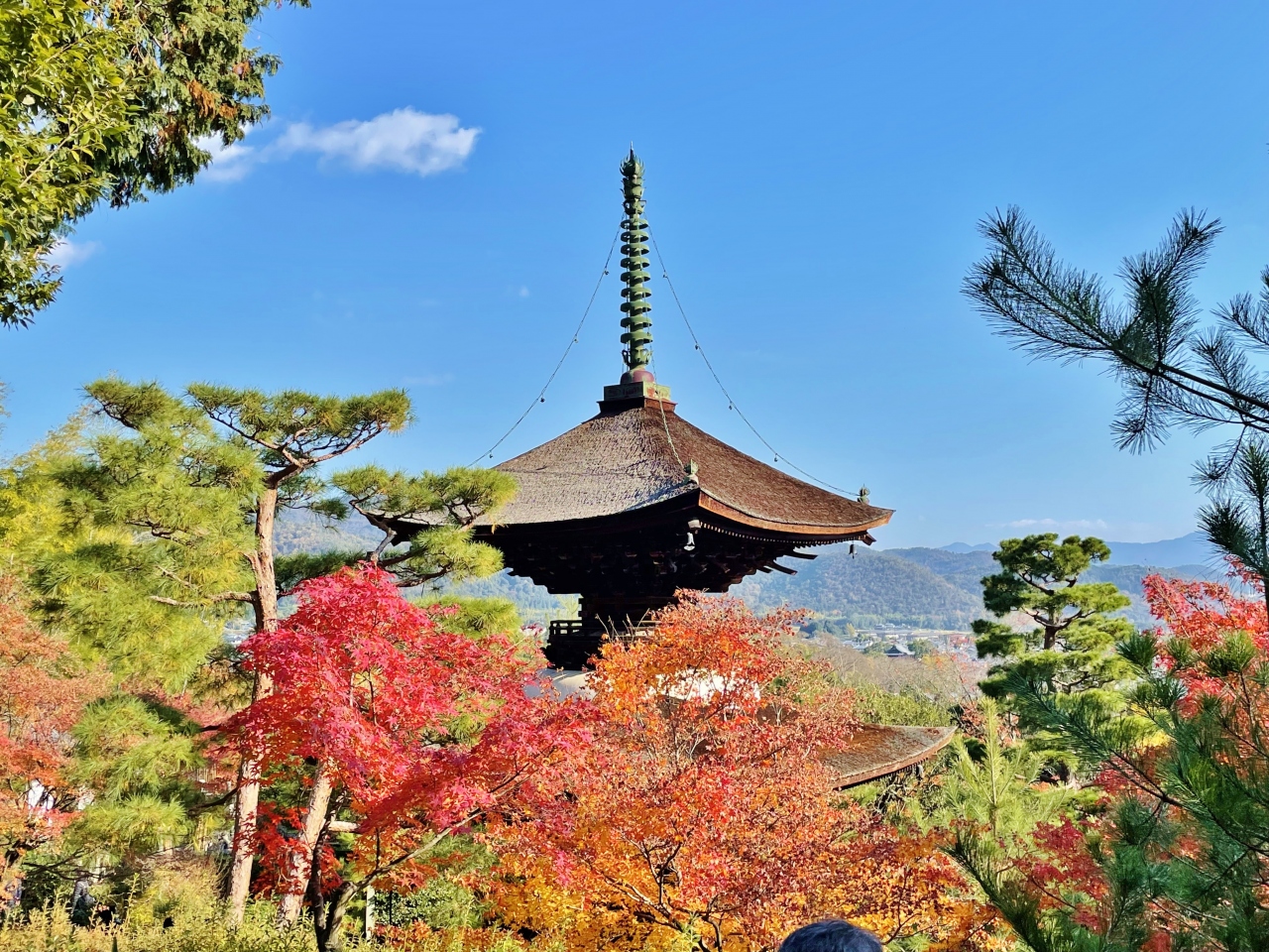 1596年の創建、百人一首で知られる小倉山の中腹にある日蓮宗のお寺で、紅葉の名所としても有名です。嵯峨野を散策中、紅葉で訪れました。ちょうど見頃を迎え、赤や黄色のグラデーションがとても美しかったです。多宝塔からは嵯峨野の山や街並みも見え、青空にも映えて良い景色でした。道幅も狭く混雑すると写真も撮りにくいので、朝早い時間に訪れることをお勧めします。