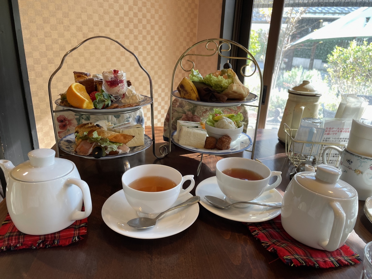 阪急岡本駅やJR摂津本山駅から徒歩で10分程、住宅街にあります。日本家屋を改装した感じで、一歩入ると素敵な庭園が目の前に広がります。事前に予約して11時の開店と同時に入り、お庭が見える窓側席に着席しました。ランチを兼ねてアフターヌーンティセットとガーデンランチョンを注文しました。ケーキやスコーン、サンドウィッチとお馴染みのセットメニューですが、セットが出てくるまで40分、紅茶が出てくるまでさらに15分と全て揃うまで1時間弱かかりました。見た目は美味しそうに見えますがお味は至って普通で、期待していただけに残念な印象が強く残りました。