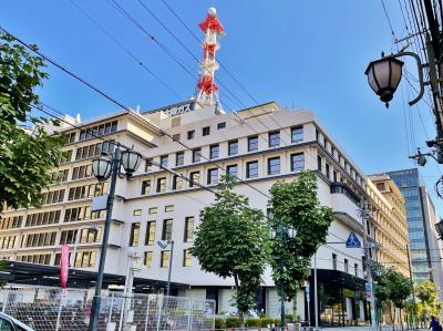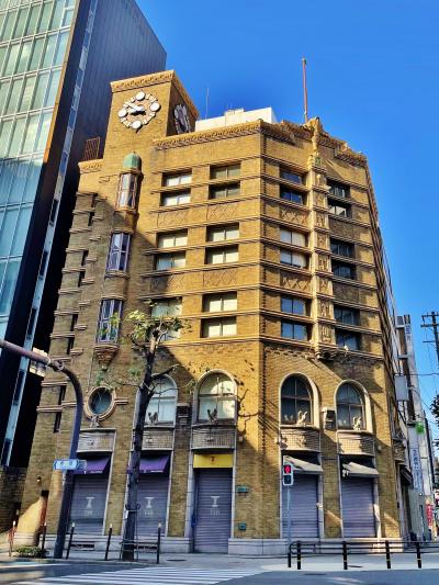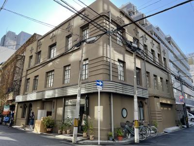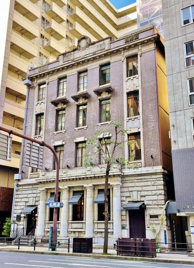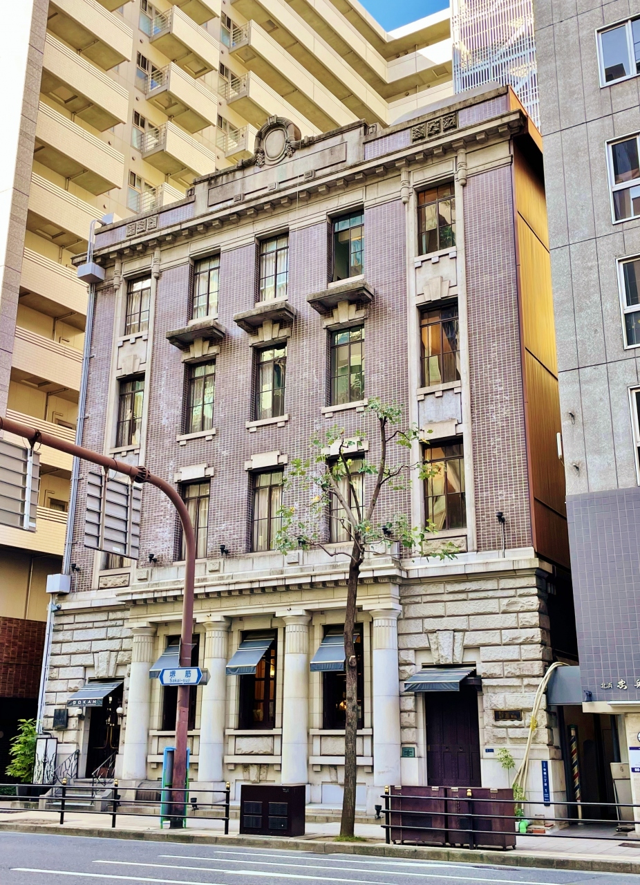北浜の堺筋に面して建つレトロビルです。昭和モダニズム建築を代表する建築家・安井武雄氏の設計により、1927年に建てられました。レンガと石造りの重厚感ある外観と、美しい壁のカーブが印象的な建物です。1階にはカフェ、上階にはオフィスが入り、現在も利用されています。