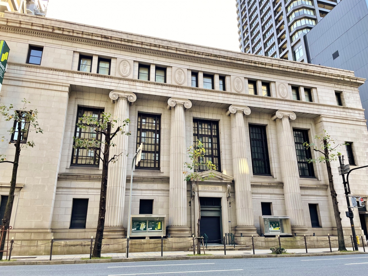 北浜の堺筋に面して建っています。1936年に建てられた旧三井銀行大阪支店です。石列柱が並ぶ古代ギリシャ神殿風建築の外観が重厚感にあふれ、周囲の建物と比べ一際目立っています。今もなお現役で営業している銀行支店ですが、重厚過ぎて入りにくい雰囲気です。
