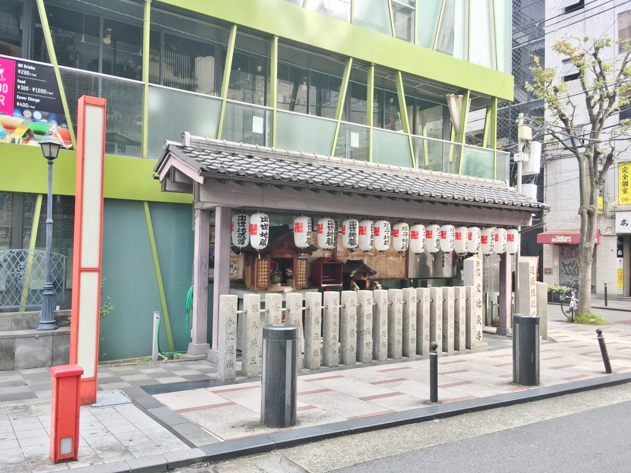 道頓堀橋から1つ西側に架かる新戎橋にあります。提灯が沢山ぶら下がっているのが印象的です。隣には水子地蔵、ふれ愛地蔵の2体のお地蔵様が並んでいます。かつては九郎右衛門町とよばれ、花街として町の発展に伴い、芸妓や俳優が出世を願って地蔵尊に願掛けに訪れるようになったことが名前の由来とのことです。