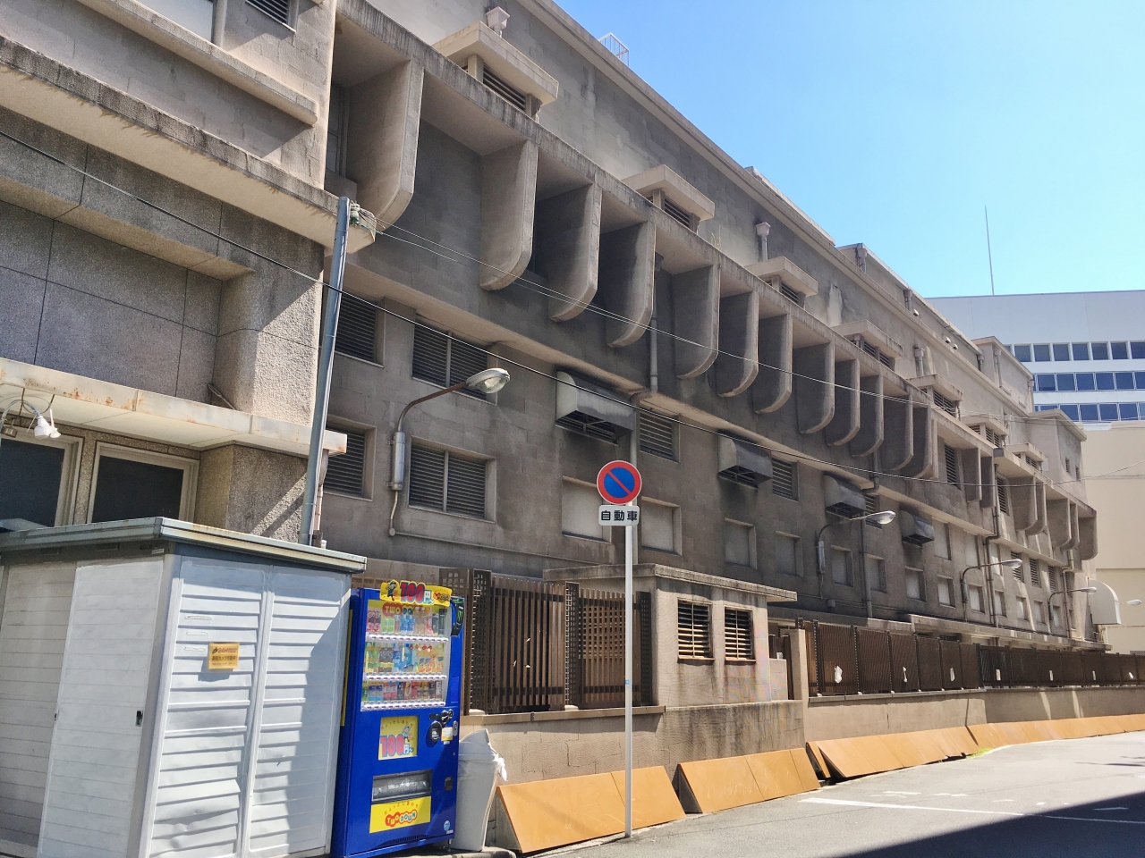 新御堂筋と合流する三差路の近くにある細長い建物です。大阪市交通局の変電所で、1933年に開通した地下鉄御堂筋線の電源供給を現在に至るまで支えています。最初に見た時はマンションにも見えました。建物のデザインについては色々な説があるようです。昭和レトロな雰囲気の建物ですが、少し独特な感じがしました。