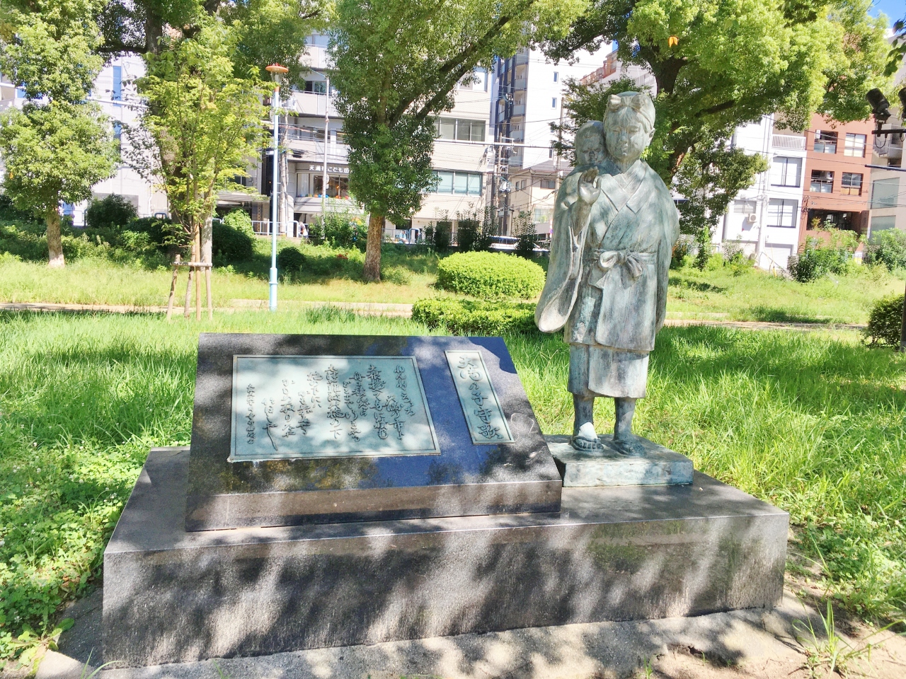 南天満公園に昔の時代を感じさせるような子を背負った像と、子守歌の歌詞が刻まれた石碑があります。この子守歌は昭和初期まで栄えた天満青物市場付近一帯で歌われていた歌とのことです。公園内には他にもモニュメントや石碑が置かれていて、当時の大阪の雰囲気が伝わり興味深いです。