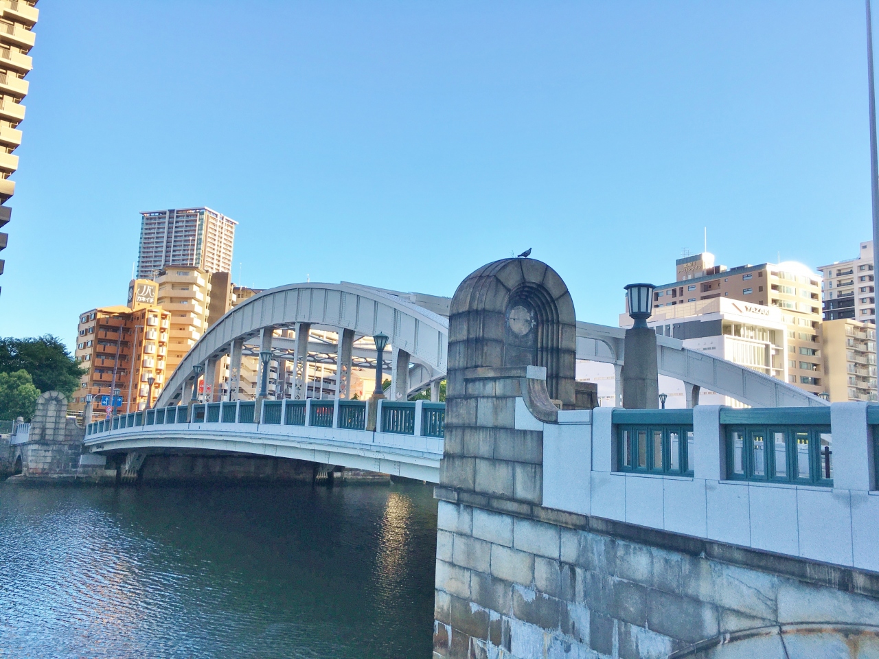 堂島川に架かるなにわ筋の橋で、大江橋や渡辺橋と同様に元禄期の堂島開発によって架けられました。現在の橋は、1929年の第一次都市計画事業によって新しく架けられました。その後拡幅工事がおこなわれ、下流側の橋が架橋されました。橋浪速の名橋50選にも選ばれています。橋自体はそれ程特徴はないですが、橋から眺める中之島川沿いに建つビル群の景色は素敵です。