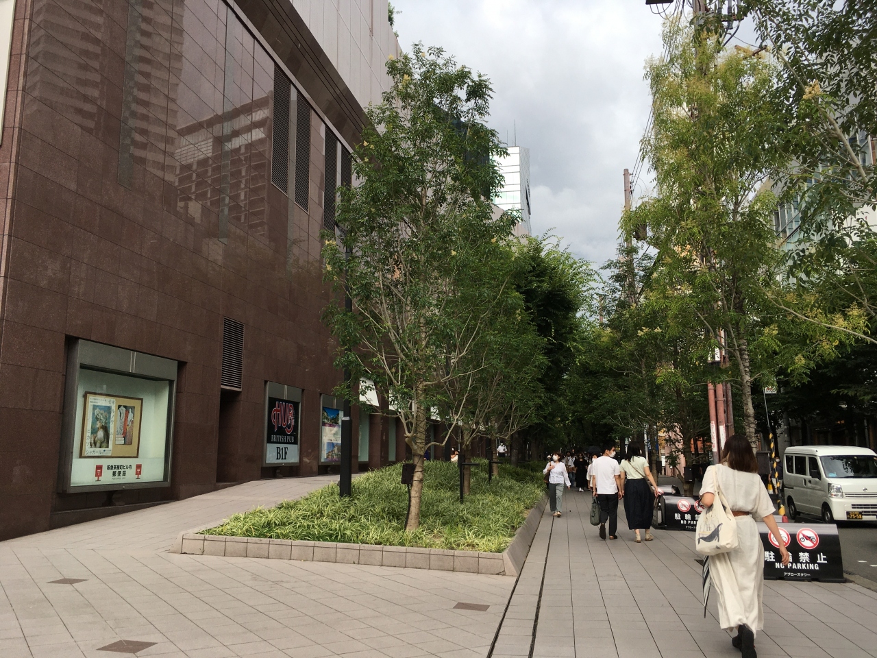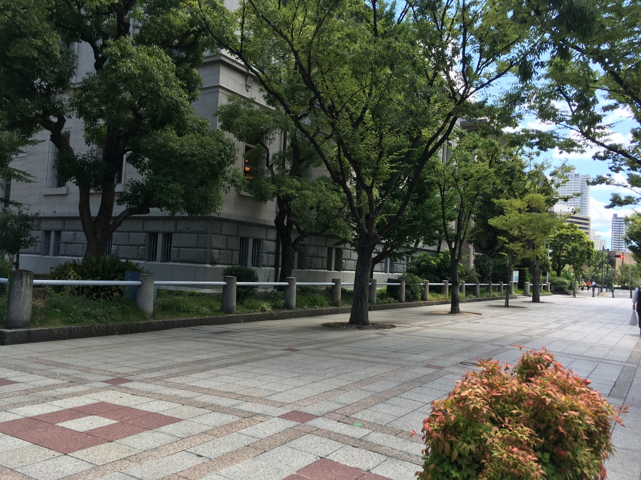 大阪市役所の南側から中之島公会堂へと続く遊歩道を指します。付近に宿泊したため、朝と夜の散歩で通りました。けやき並木が立ち並び、夏だったので新緑がとても綺麗でした。朝や夕方は通勤客も多いですが、良く整備されているのでお花も咲いていて散歩するのに気持ちの良い通りです。