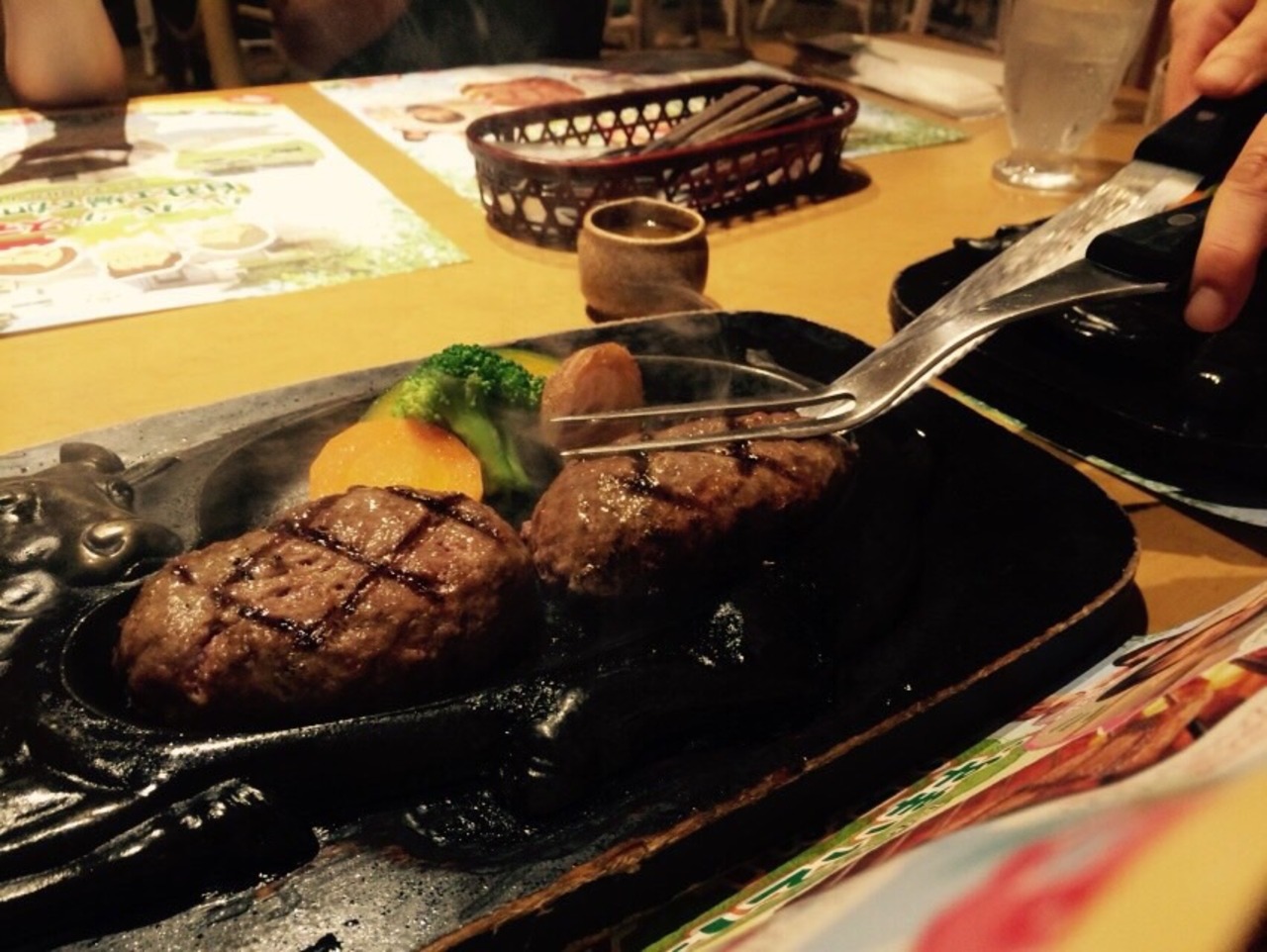 げんこつハンバーグとおにぎりハンバーグは目の前で切って鉄板に押し付けてくれます。