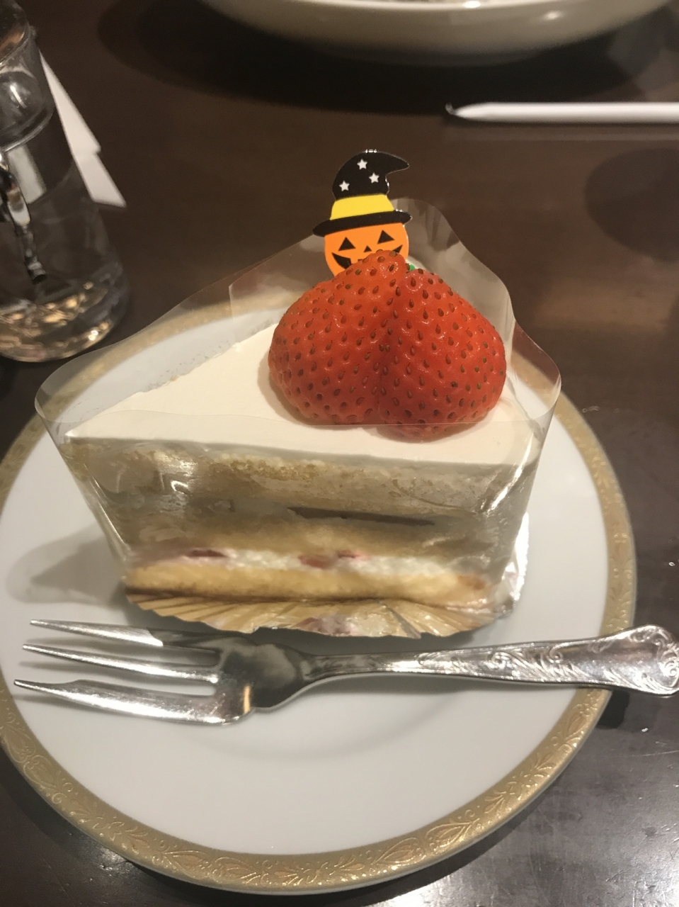 ケーキセットでイチゴのショートケーキにしたらハロウィン仕様になってた。かわいい。