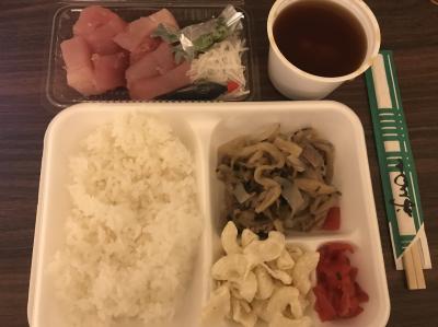 おさしみとマカロニサラダ、謎のおかず、福神漬け、赤だしがついてた。