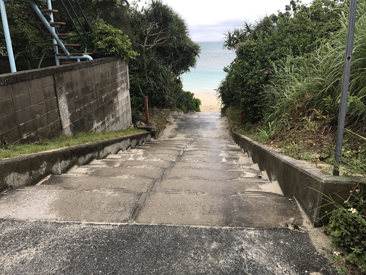 小雨で風の強い日だったけど、ビーチにたどり着くまでが怖い。
