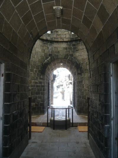 屈曲し、やや傾斜となった細い道を進むと、樹木に囲まれ、独特のデザインを特徴とする