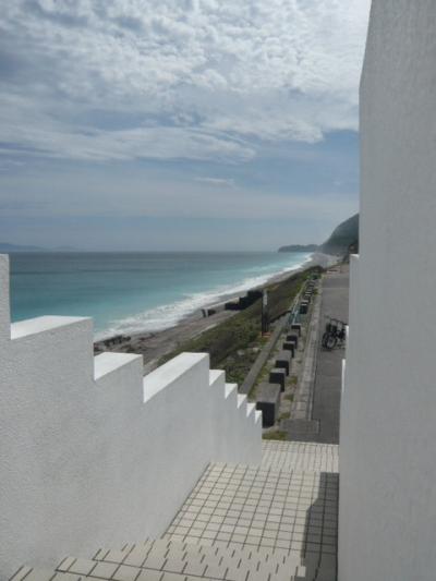 新島ガラスアートセンターは、青い空と海の色に映えている白亜の美しい美術的な建物です。