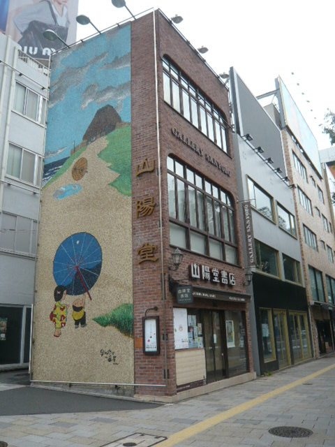 山陽堂書店の建物は、壁の色が、茶色で、目立つ建物です。