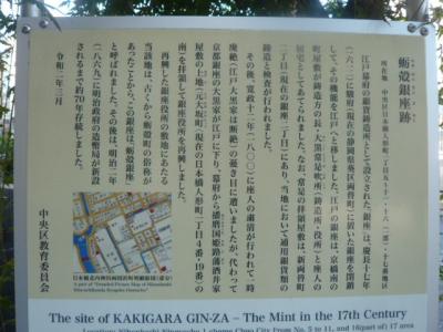 日本橋の蛎殻町に、蛎殻銀座跡の解説板があります。江戸時代、銀貨幣を造っていた銀座がありました。