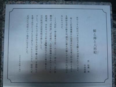 人形町通りから西に入ると、人形町小学校に至る道路の角に、鯨のモニュメントがあります。解説板もあります。