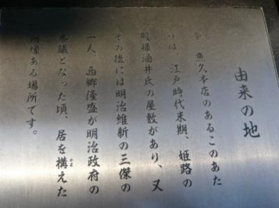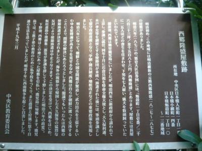 西郷隆盛屋敷跡の標識が、日本橋人形町にあります。参議になった際、姫路藩酒井家の屋敷跡に居住しました。