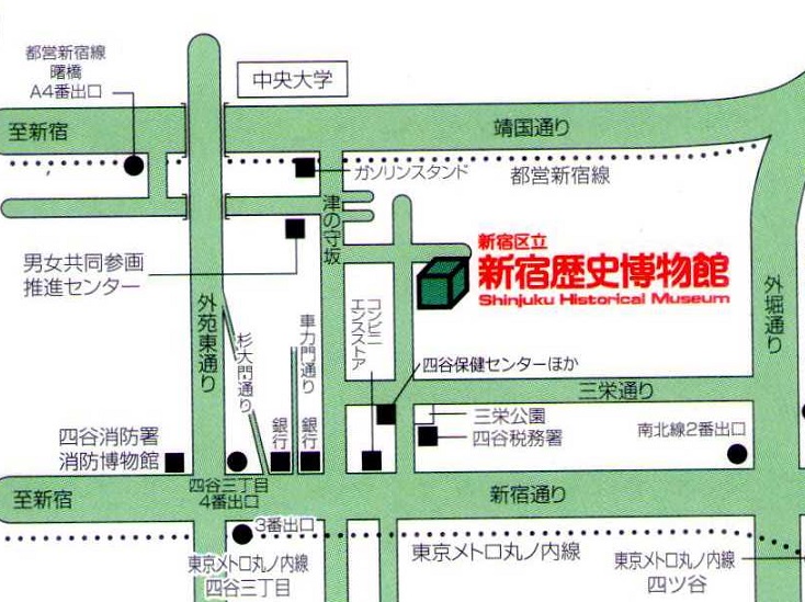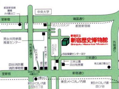 新宿歴史博物館は、四ツ谷駅からすぐの、三栄町の靖国通りに降りる坂の中腹にあります。