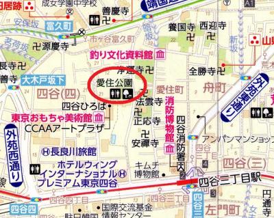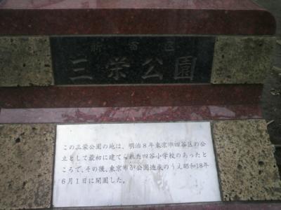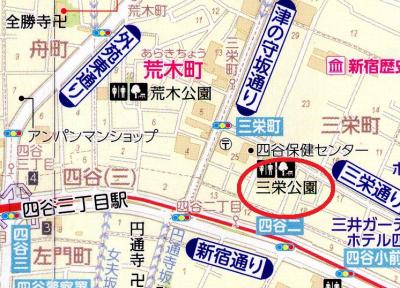 三栄公園は、四ツ谷駅の近くにあり、新宿通りの北側の公園です。