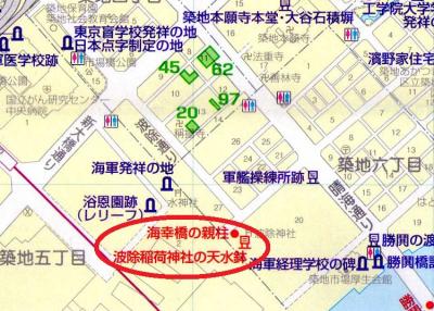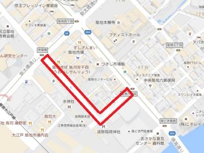 ちょうど、築地の市場外市場からの波除通りが波除神社に突き当たる場所の西側です。