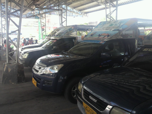 高速バスの発着に連接するため、ソンテウやバイクタクシーが待機しています。