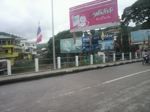 橋の上での国境は、どこか判然としませんが、両国の国旗の中間付近とするならば、どうも、サーイ川の中間点付近ではなく、ややミャンマー側に寄った地点が国境線のようです。