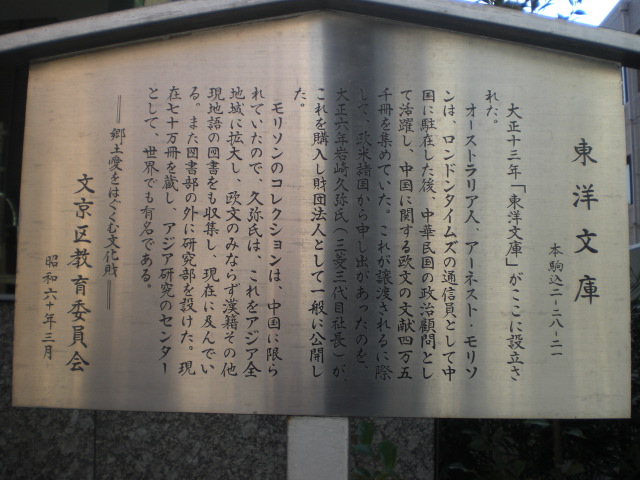 三菱財閥の岩崎久弥が、1917年、モリソンの所蔵する中国に関する欧文文献の膨大な蔵書を購入し、日本を含めた東洋全域に関する民間の図書館兼研究所である東洋文庫を設立しました。