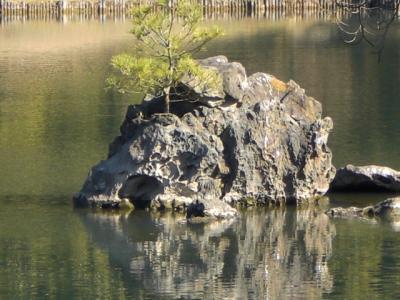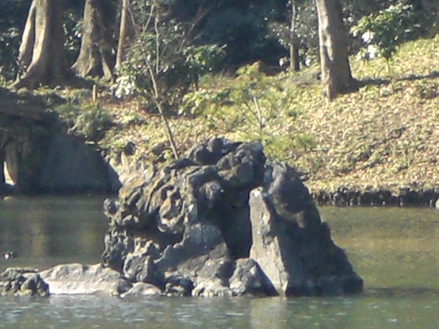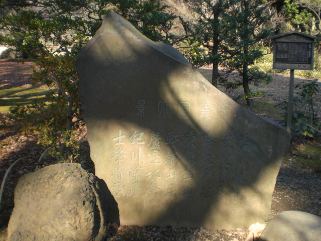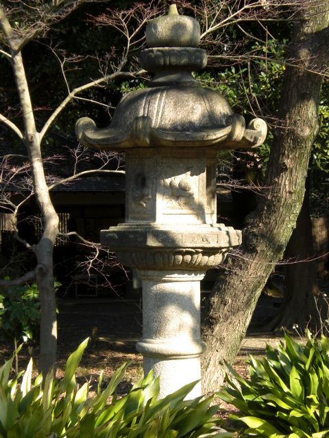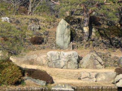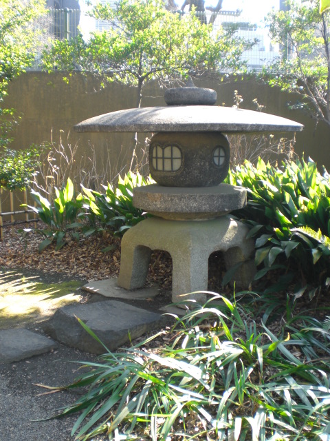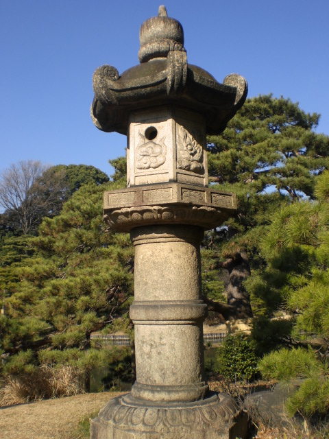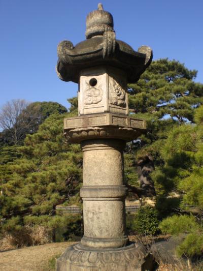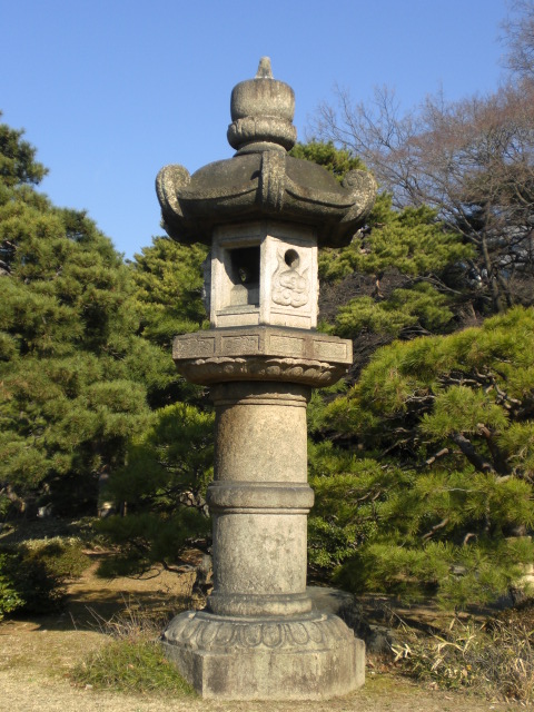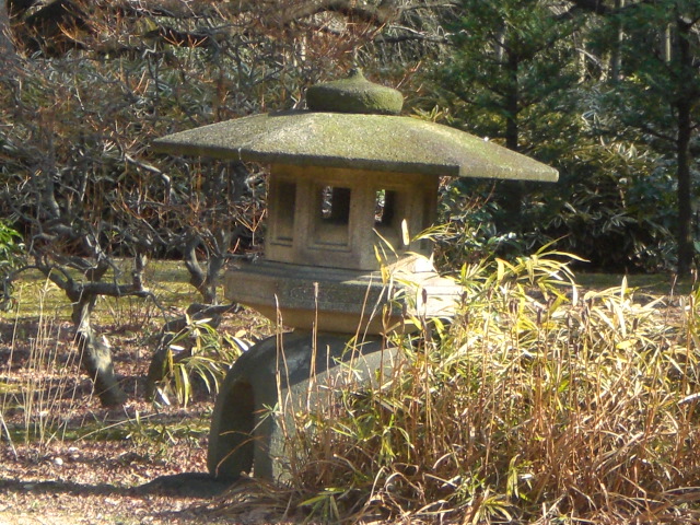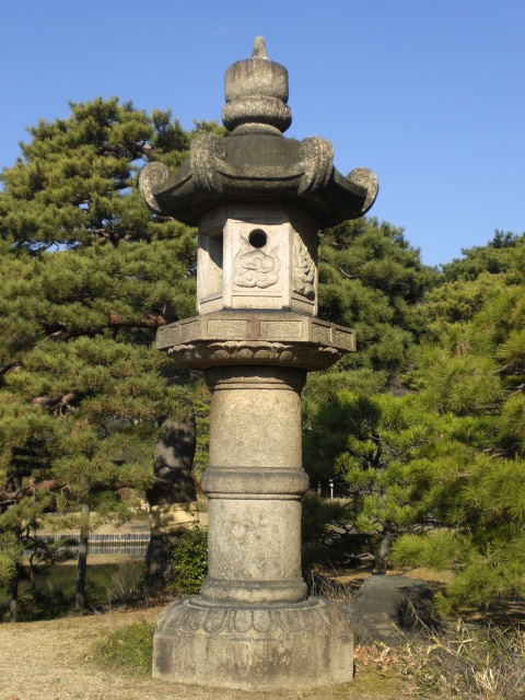 六義園にはいろいろな石灯籠があります。中には、人間の背丈以上のものもあります。