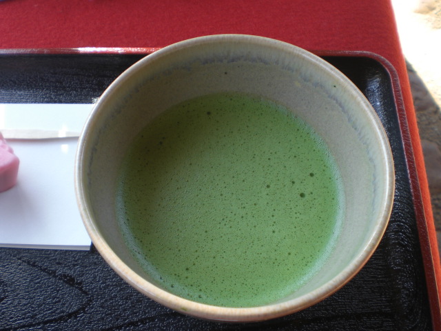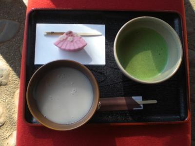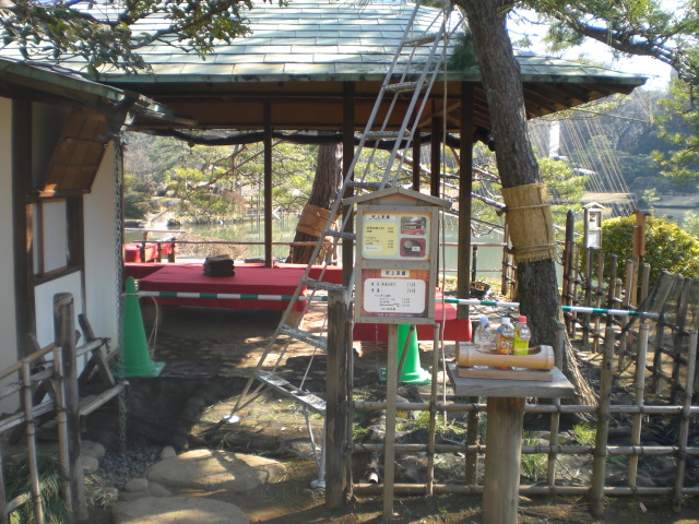 平屋の方丈の和室の脇に、赤毛氈の席を置き、六義園を廻る入園者に対して、一服の抹茶や甘酒を振る舞います。