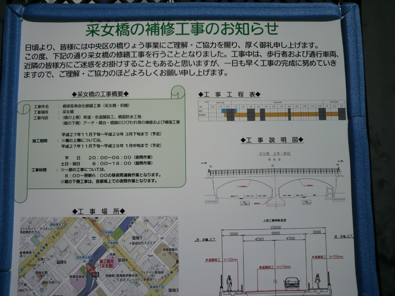 采女橋の下は、築地川でしたが、昭和37年に高速道路が築地川の上に造られたため、現在の采女橋の下は高速道路が走っています。- 旅行時期