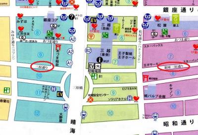 銀座の三原通りは、銀座中央通りの東側にあり、銀座中央通りと並行しています。