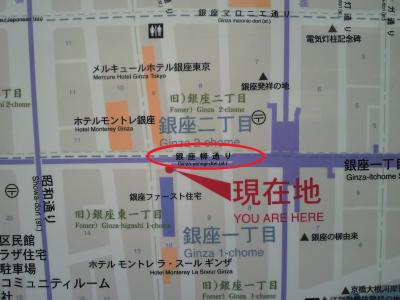 銀座レンガ通りは、銀座中央通りから西に2本目、西銀座通りから東に2本目の通りで、ちょうど両通りの中間にあります。