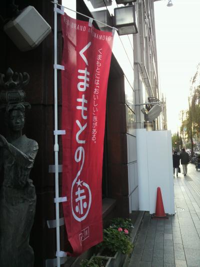 赤いのぼりと黒いくまモンの鮮やかな対照が目につきます。